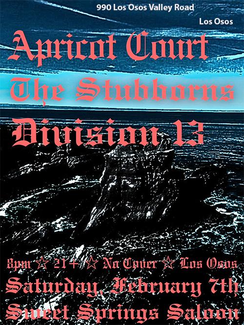 Apricot Court, The Stubborns, Division 13 perform at Sweet Springs Saloon, Los Osos