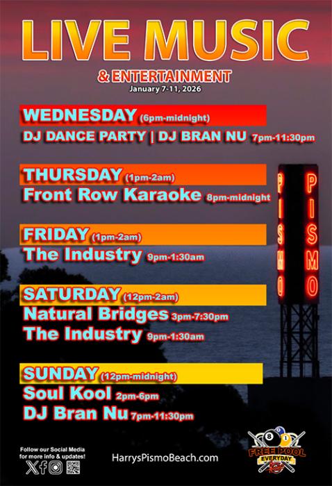Soul Kool ( 2-6:00PM ), DJ Bran Nu ( 7-11:30PM ) perform at Harrys Nightclub and Beach Bar, Pismo Beach