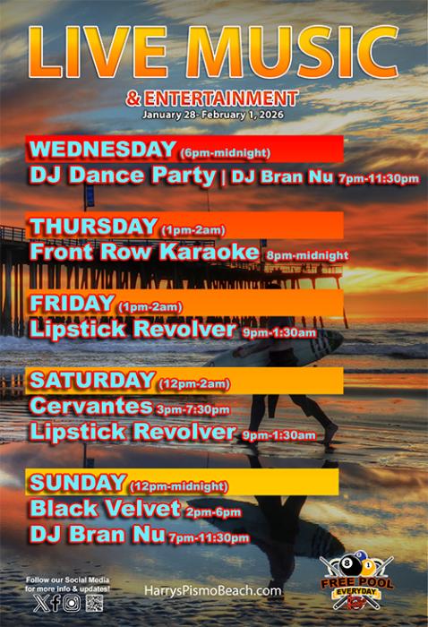 Black Velvet ( 2-6:00PM ), DJ Bran Nu ( 7-11:30PM ) perform at Harrys Nightclub and Beach Bar, Pismo Beach