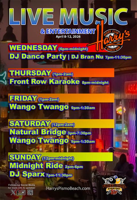 Midnight Ride ( 2-6:00PM ), DJ Sparx ( 7-11:30PM ) perform at Harrys Nightclub and Beach Bar, Pismo Beach