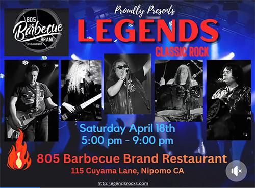Legends ( Rock ) perform at 805 Barbecue , Nipomo ( 5-9PM )