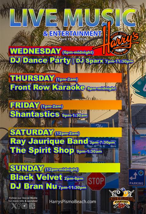 Ray Jaurique Band ( 3-7:30PM ), The Spirit Shop ( 9- 1:30AM ) perform at Harrys Nightclub and Beach Bar, Pismo Beach